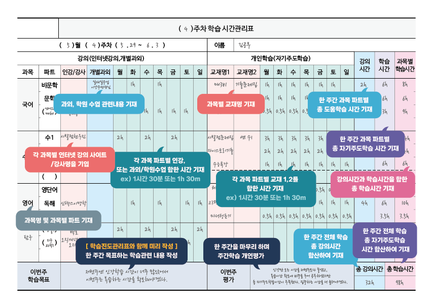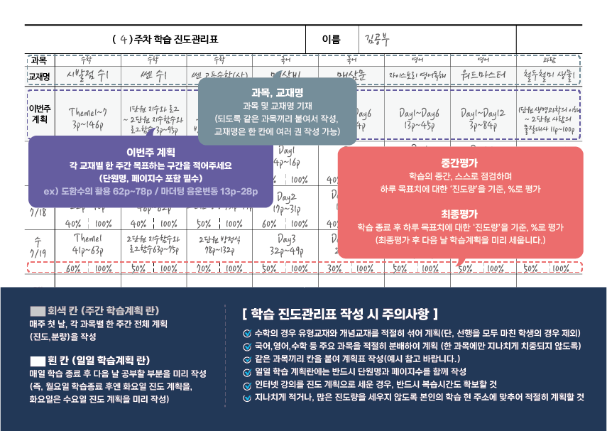 그러한 학생들을 잡아주고자 진도관리표를 작성합니다.